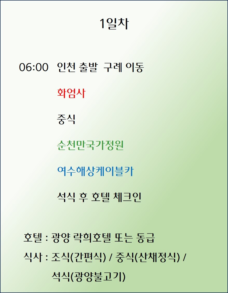 06:00 인천시청역 7번출구 출발 > 구례군 이동 > 화엄사 > 중식 > 순천시 이동 > 순천만 국가정원 >