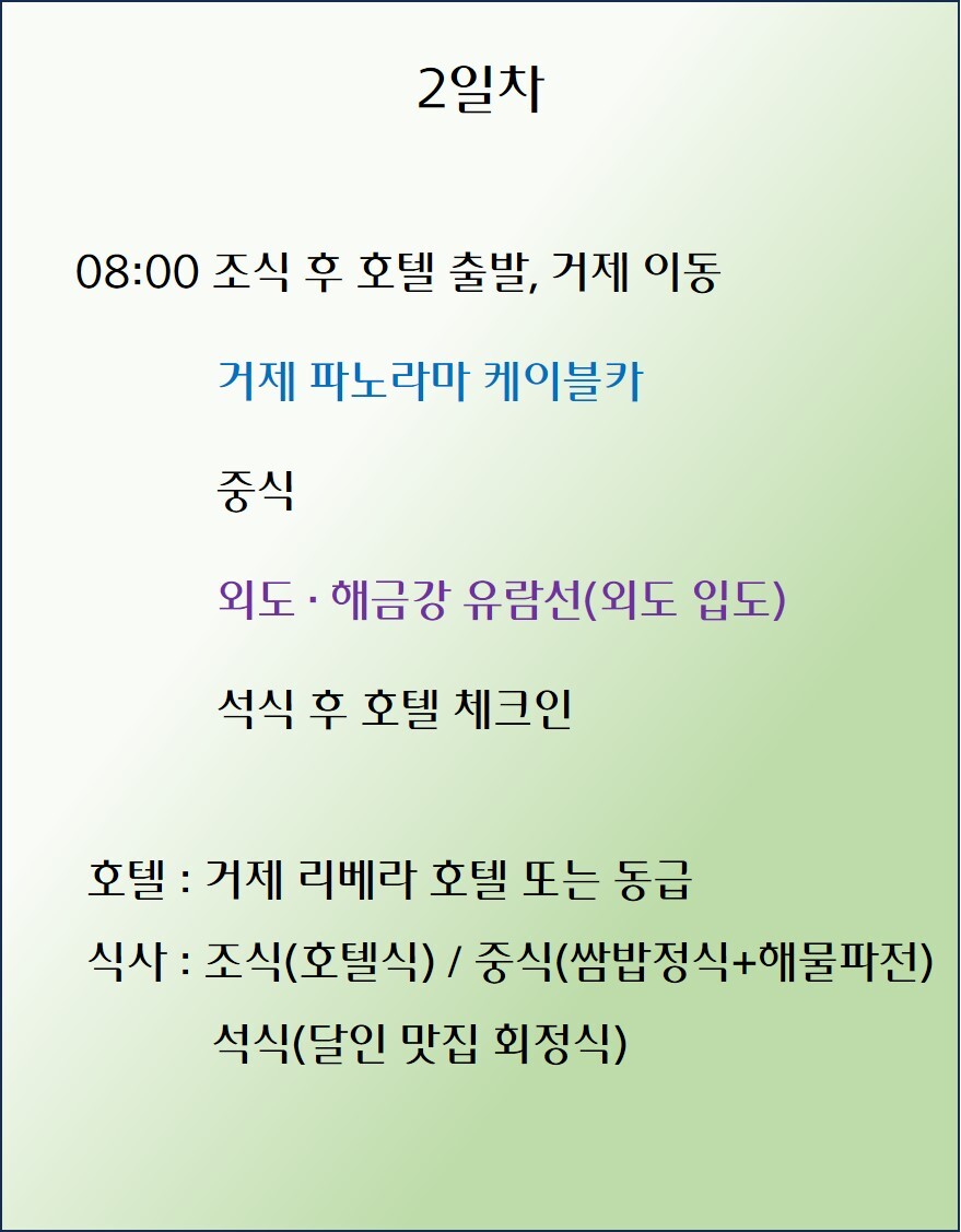 호텔 출발 >거제 이동 > 거제 파노라마 케이블카 > 중식 > 외도 해금강 유람선 > 외도 > 석식 > 호텔 체크인 후 자유시간 및 휴식