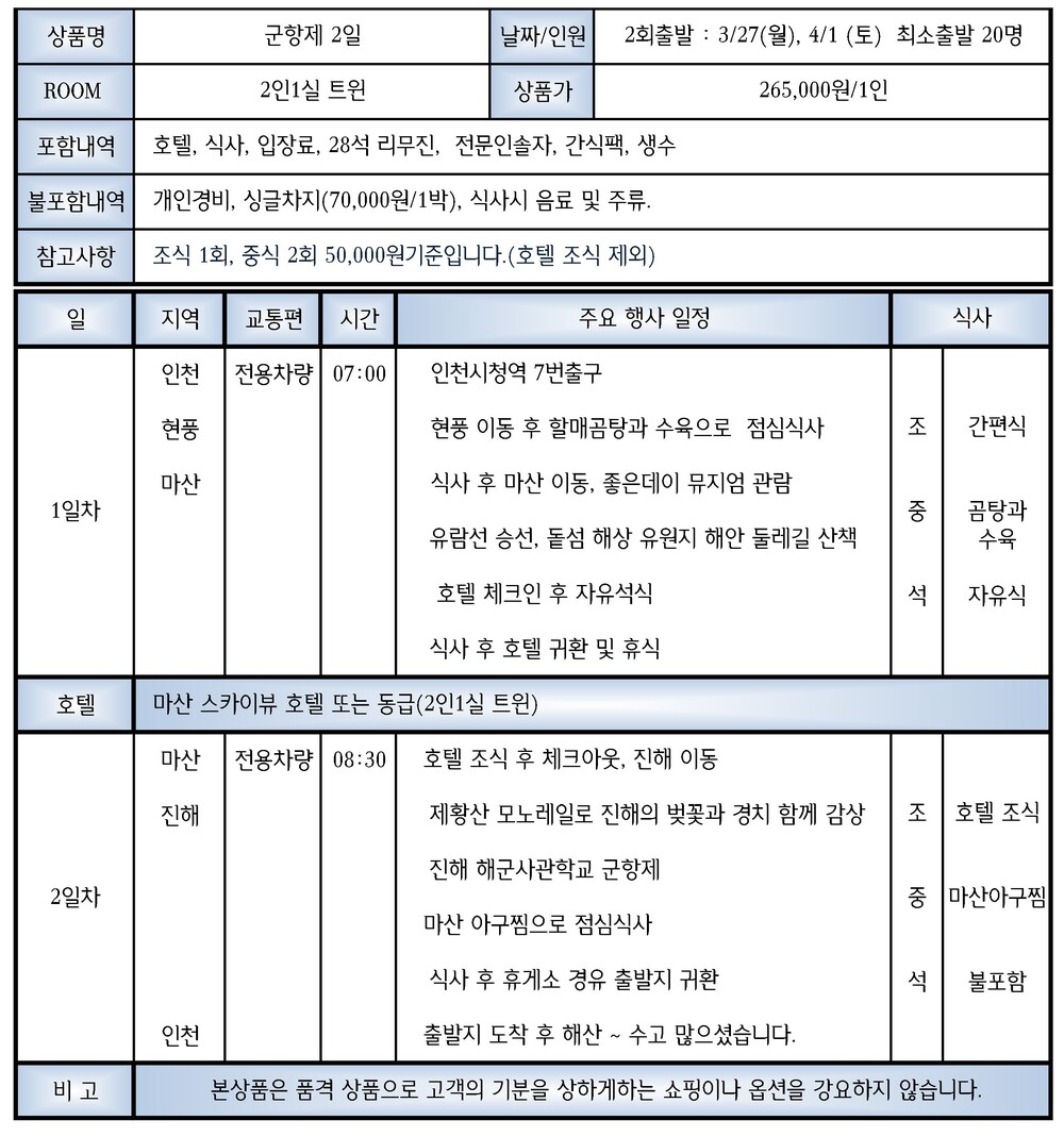 인천시청역 7번출구 출발 > 현풍 이동 > 점심식사 > 마산 이동 > 굿데이 뮤지엄 > 돝섬 해안둘레길 > 호텔 체크인 > 석식 > 자유시간 및 휴식
