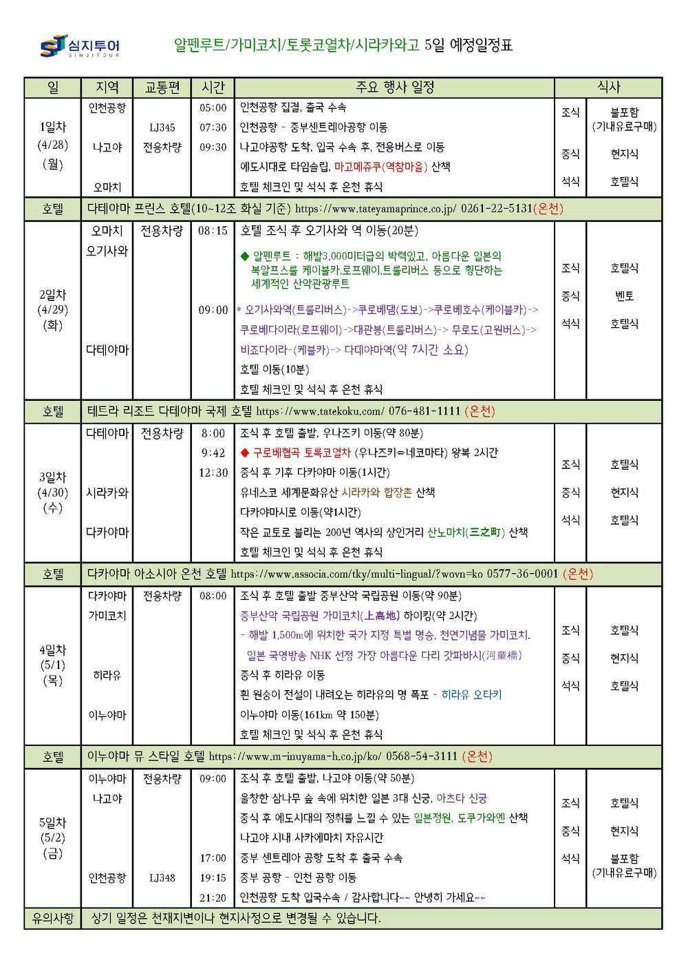알펜루트/가미코치/토롯코열차/시라카와고 5일(온천호텔)
