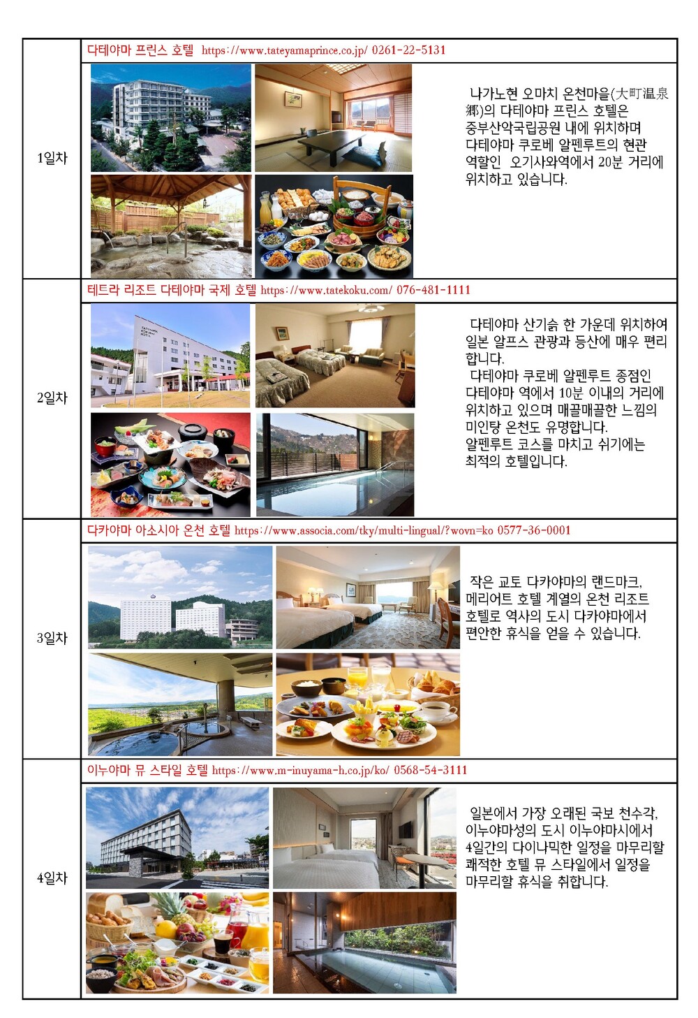 08:15 호텔 출발 > 오기사와역 이동 > 다테야마 쿠로베 알펜루트(약 7~8시간 소요) > 다테야마역 > 호텔 체크인 후 석식 및 온천욕과 휴식