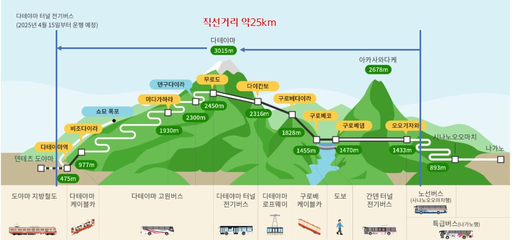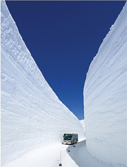 ► 높이 20m 가까운 대설벽으로 유명한 다테야마쿠로베 알펜루트는 매년 4월부터 11월까지 개장합니다. 개장 초기 4월 말임에도 해발 2450m 무로도 고원에서 보는 높이 18m에 육박하는 대설벽은 보는 이들을 압도하는 다이나믹함 그 자체라고 할 수 있습니다. 고산 관광 컨텐츠로 유일무이하게 대자연을 감상하면서 동시에 다양한 교통 수단을 체험하는 코스입니다. 직선거리로는 25km정도이나 트롤리 버스, 케이블카, 로프웨이, 전기버스 등 4종류의 교통 수단을 6번 탑승하여 약 7시간에 걸쳐서 3,000m급 고산 2개를 횡단하게 됩니다. (사진 출처:다테야마 쿠로베 알펜루트 공식 홈페이지)