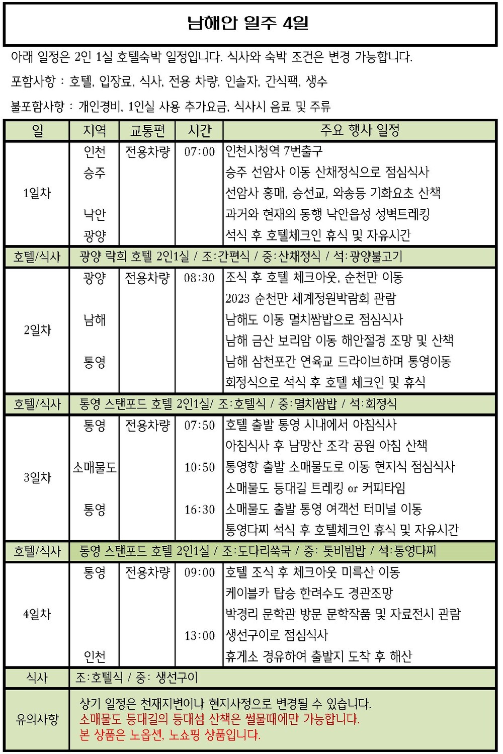 ※ 여행일정 및 자유시간 중 고객님의 안전을 위하여 가이드의 안내사항 및 안전수칙을 준수하여 모든 안전사고에 유의하시기 바랍니다.특히, 현지 선택관광 또는 자유일정은 가이드의 주의사항 및 사전 안내문구를 숙지 후 참여와 관광을 결정하여 주시기 바라며, 이용자 본인의 과실 및 본인 건강상태로 인하여 발생한 안전사고에 대해서는 이용자 본인의 책임임을 알려드립니다.※ 현지사정 (선사사정, 정기적인 케이블카 점검으로 인한 휴장 ) 또는 갑작스런 기상변화 (풍랑,강풍) 으로 인하여 유람선 또는 케이블카 등의 운행이 불가할 경우 대체일정으로 진행됩니다.