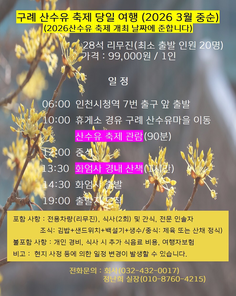 중국 산동성에서 한국의 산동으로 전해져 1000년 이상 이어져 내려오고 있습니다. 봄의 느낌과 잘 어울리는 노란 빛의 산수유 꽃으로 마을 전체가 물들게 됩니다.