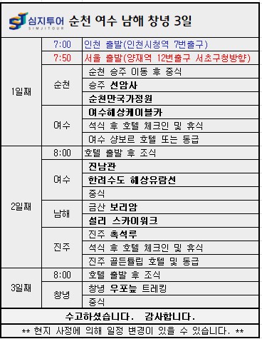[국내여행 스탠다드] 여수/남해/창녕 2박3일매주 수, 일요일 출발