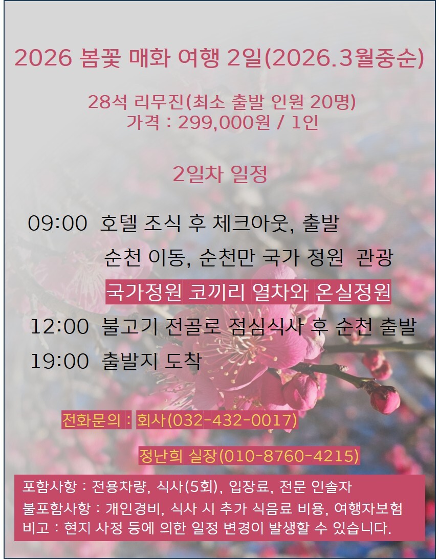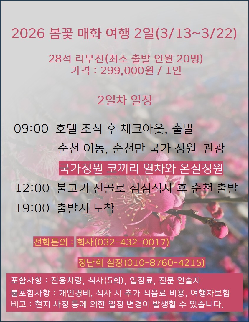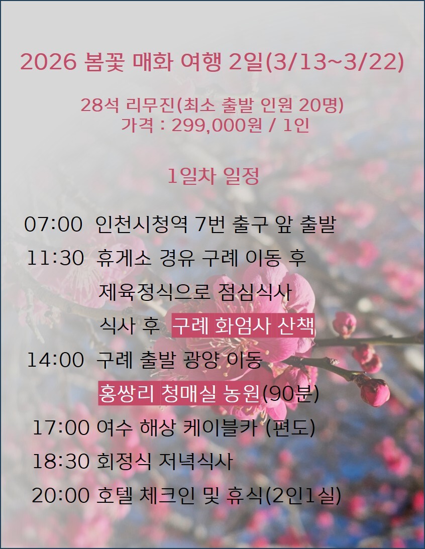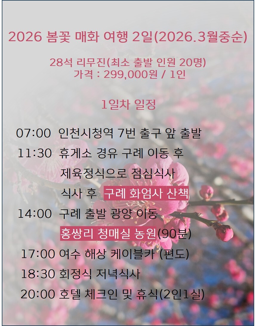 07:00 인천 출발 > 구례 이동(약 4시간 30분 소요) > 중식 > 구례 화엄사 > 광양 이동 > 청매실농원 > 여수 이동 > 여수 해상케이블카 > 석식 > 호텔 체크인 및 휴식