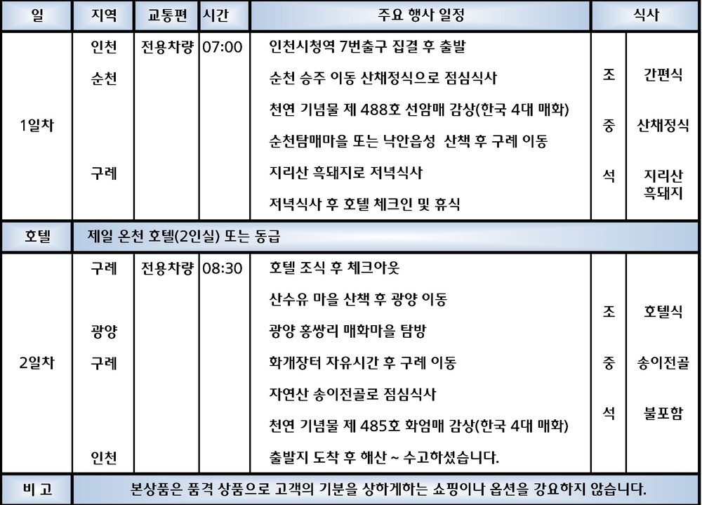 조식 후 호텔 출발 > 구례 산수유 마을 > 광양 이동 > 광양 홍쌍리 매실 마을 > 하동 이동 화개장터 > 화개장터 >구례 이동 > 중식 > 구례 화엄사 > 휴게소 경유 출발지 귀환