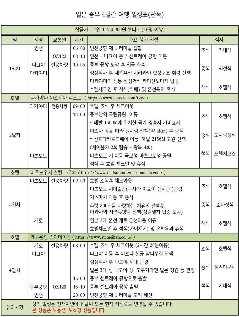 인천 공항 출발 > 나고야 중부공항 도착 > 중식 > 다카야마 이동 > 시라카와 합장구조 취락 > 다카야마 산노마치 > 호텔 체크인 후 석식 및 온천욕과 휴식